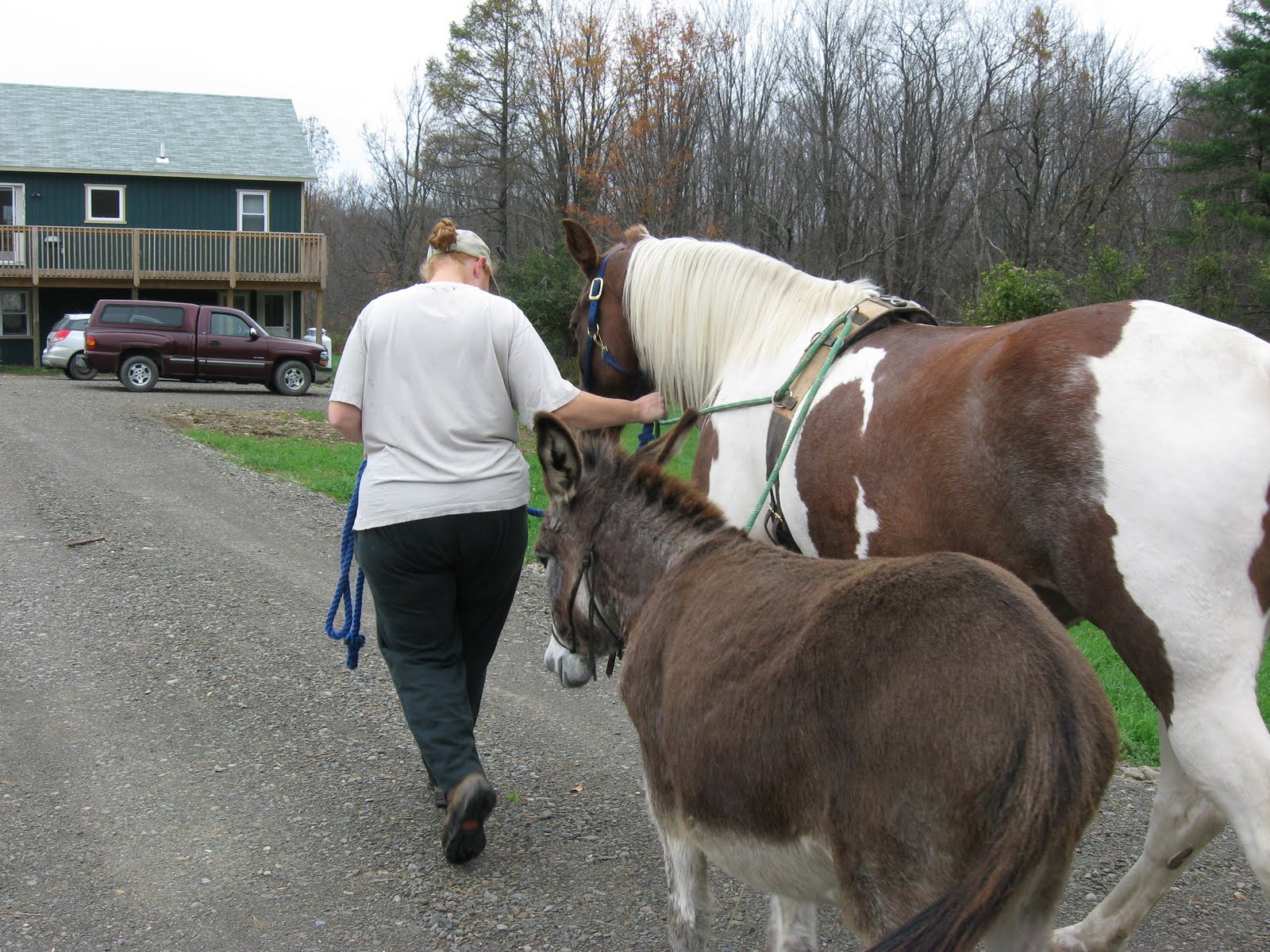 I am trying to be optimistic about Tessa's future as a riding horse, hoping that she is on her way to a full recovery. This would pose a minor obstacle however...what to do with Emma while Tessa and I are out blazing the trails? The answer is simple, Emma just has to come with us of course. The exercise is just what a donkey needs. To that happy end, I have been trying to teach Emma to pony off of Tessa. All without actually riding Tessa.