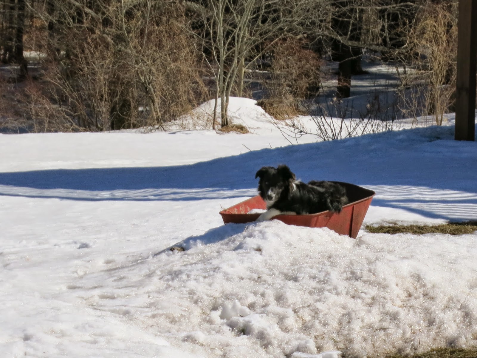 We had a couple of nice days last week and a couple of grey, drizzly days that managed to knock the snow pack down by about seven inches. We still have a whole dog's worth of snow though, at least 24 inches....